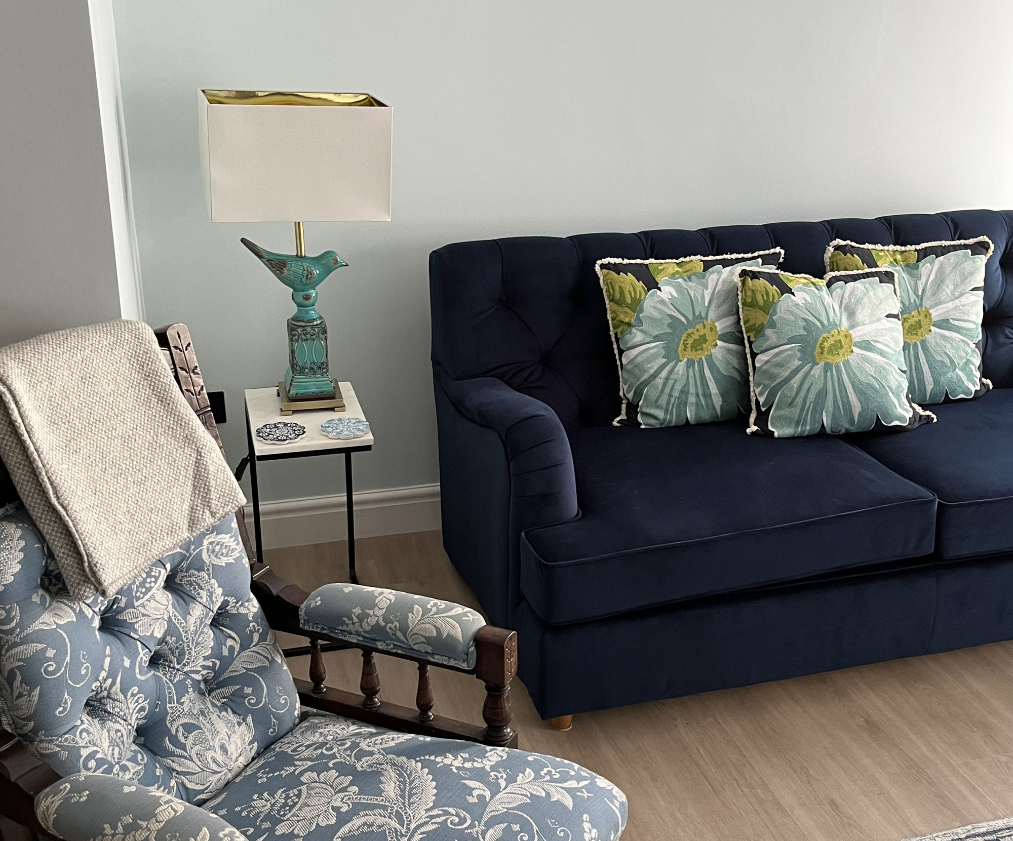 With a cool blue colour scheme and original fireplace (non working) this apartment offers a spacious bedroom, complete with a king-sized bed and television, providing you with comfort and entertainment.