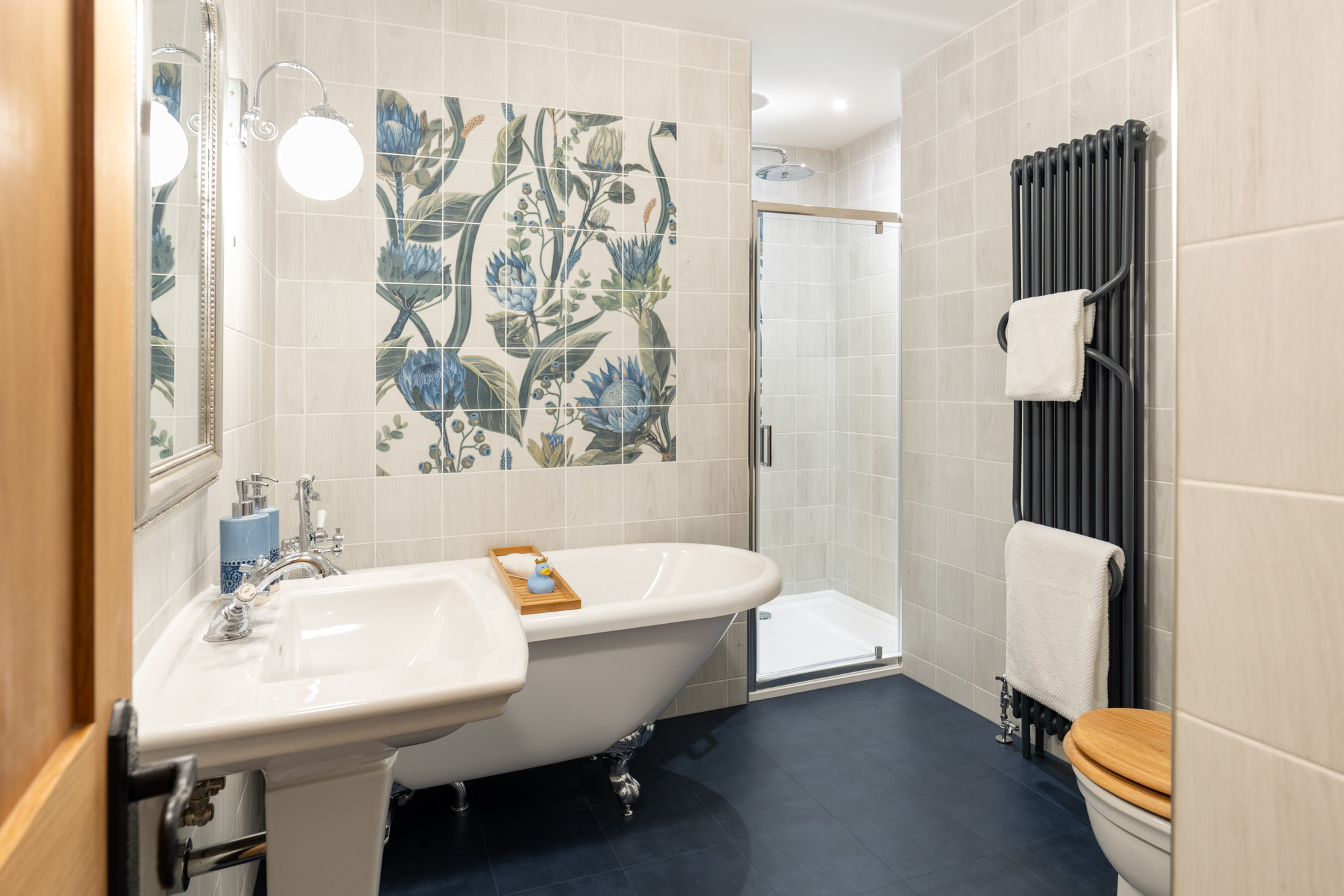 The large bathroom features a delightful roll-top bath and walk-in shower, creating a feeling of serenity and relaxation.